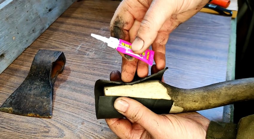 Обхватываем обработанную часть рукояти подходящим по длине и ширине куском резины, стыки смазываем суперклеем, сводим края и прижимаем их к топорищу примерно в течение 1-ой минуты. В передней части топорища резина должна выступать за его пределы.