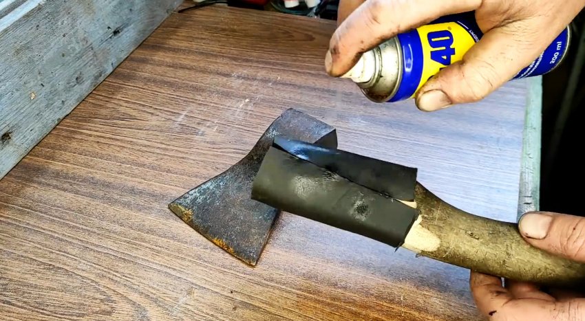 Для того чтобы было легче просунуть топорище, обернутое резиной в проушину, смазываем ее снаружи и проушину внутри средством WD-40. Насаживаем головку топора на длину до тех пор, пока торец топорища не покажется из переднего края проушины.