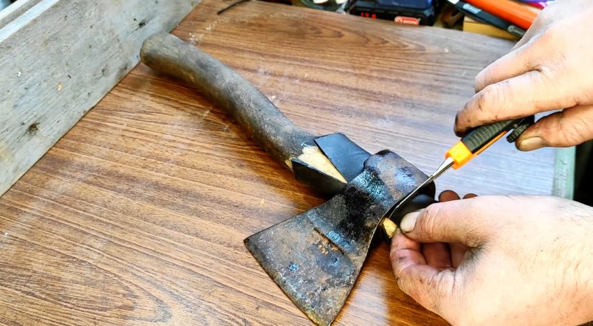Деревянное топорище из любой породы дерева со временем начинает усыхать, ее волокна уплотняются и сжимаются, и с этим ничего поделать нельзя. Такова природа древесной структуры. В результате головка топора разбалтывается на рукояти и, казалось бы, что выхода из такого положения нет, к каким бы мы не прибегали ухищрениям. Но он, оказывается, есть, если при реализации этой операции использовать кусок обычной резины, например, от автомобильной камеры.