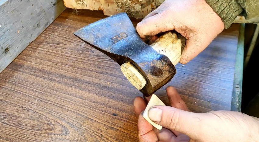 Теперь необходимо забить не слишком толстый клин, который можно сделать, положим, из сухого березового полена.