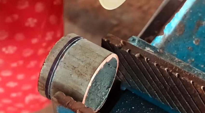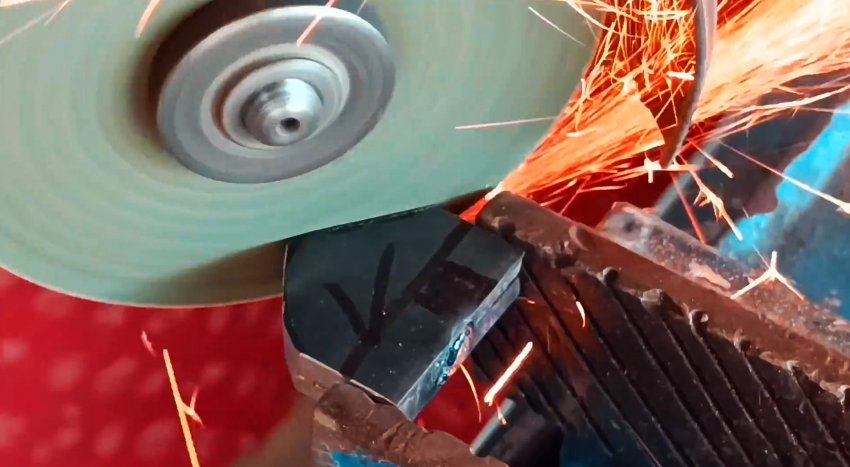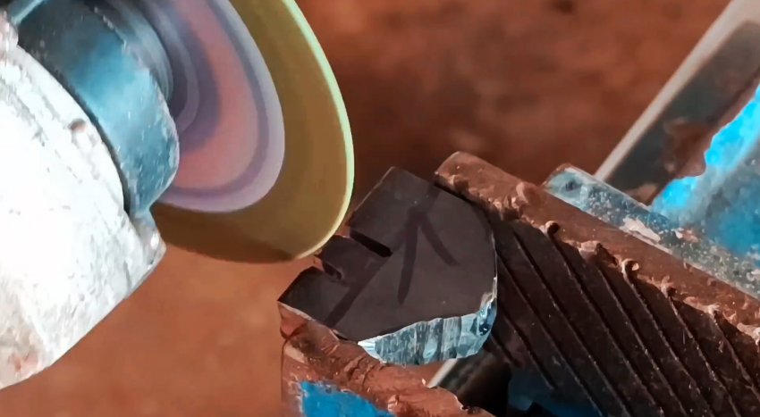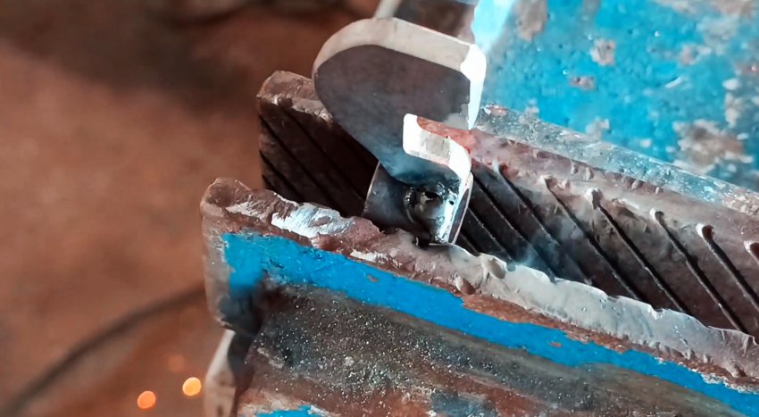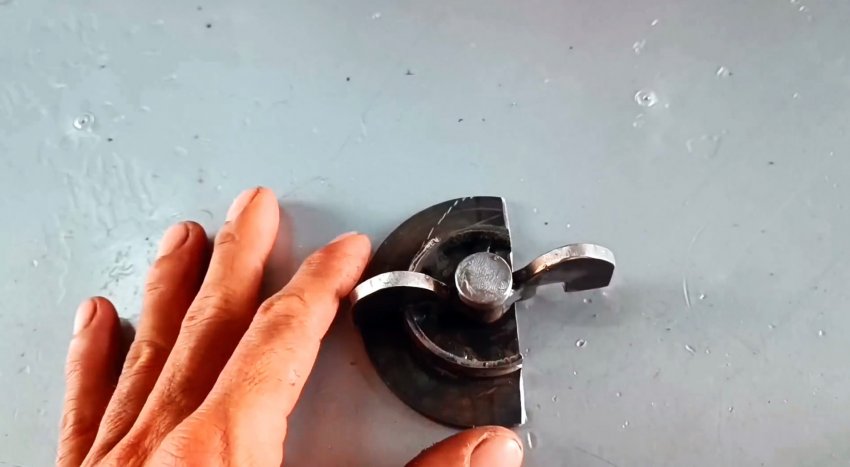 Шестигранную головку болта скругляем, используя дрель и болгарку. Из двух пластин размером 28?32 мм фигурные детали с прорезью на плоской стороне, равной высоте кольца, приваренного к кругу.