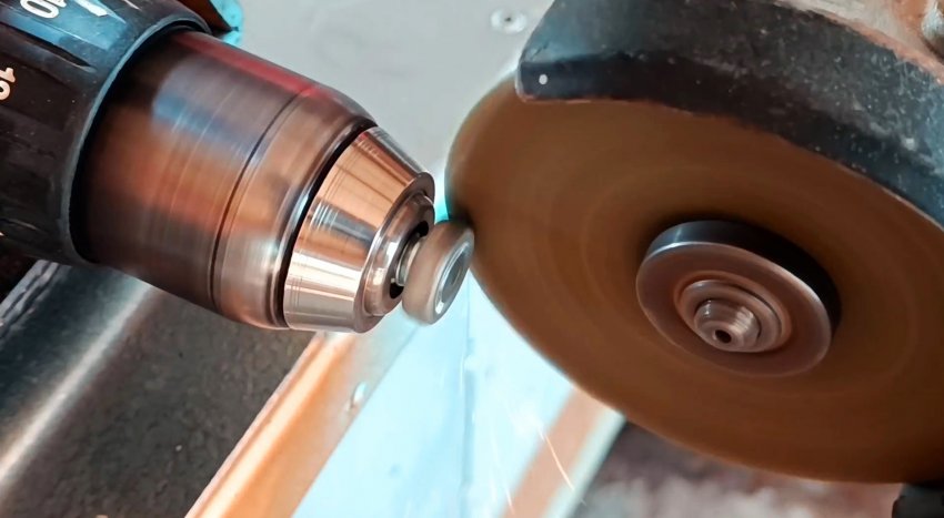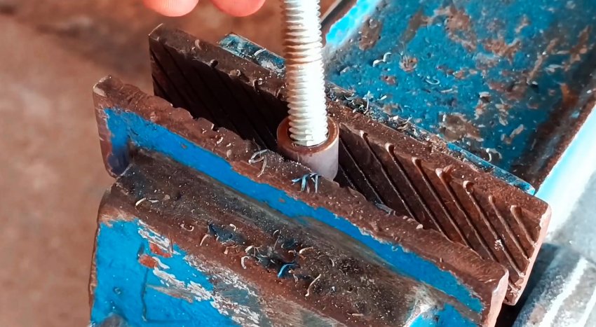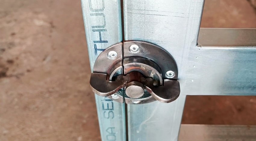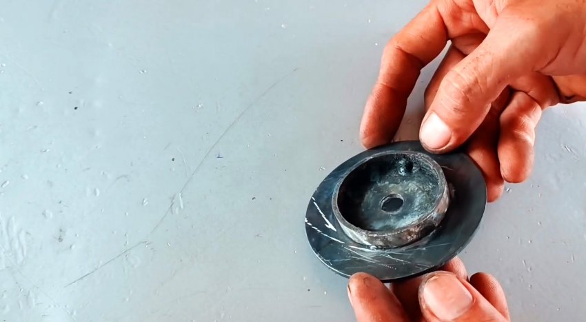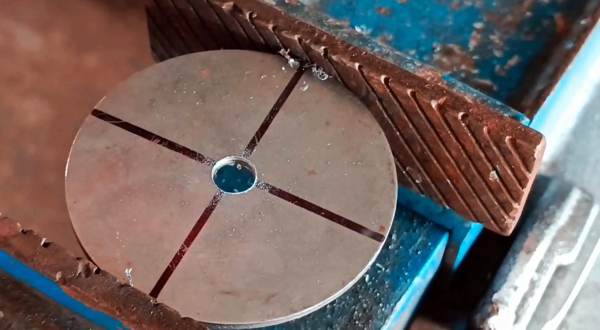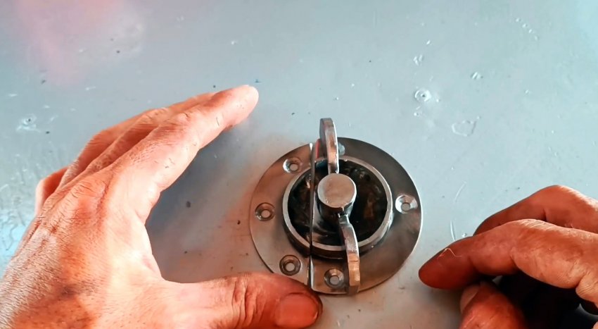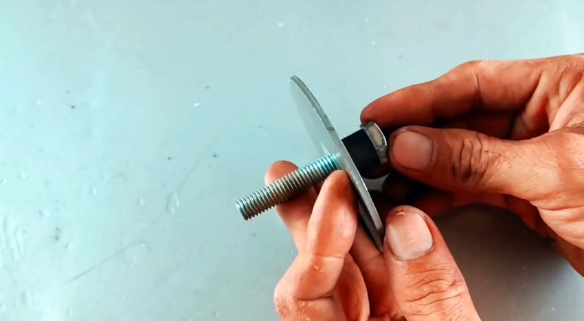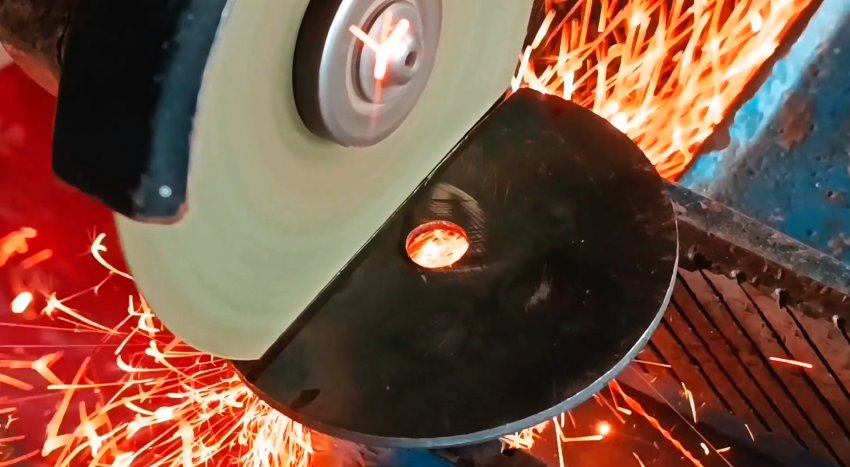 Находим центр металлического круга и просверливаем сквозное отверстие под болт с шестигранной головкой. Под него же рассверливаем отверстие укороченной верхней части приварной петли.