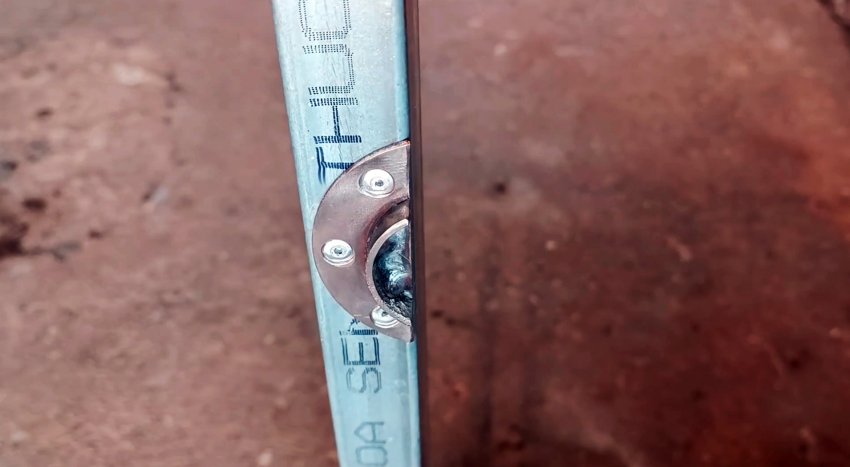 В частях круга по окружности высверливаем по 3 отверстия для их крепления к двери. Меньшую часть круга с помощью заклепок крепим к дверной раме так, чтобы линия отреза совпадала с внутренней гранью рамы.