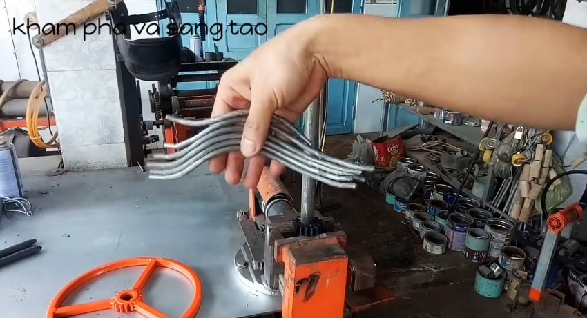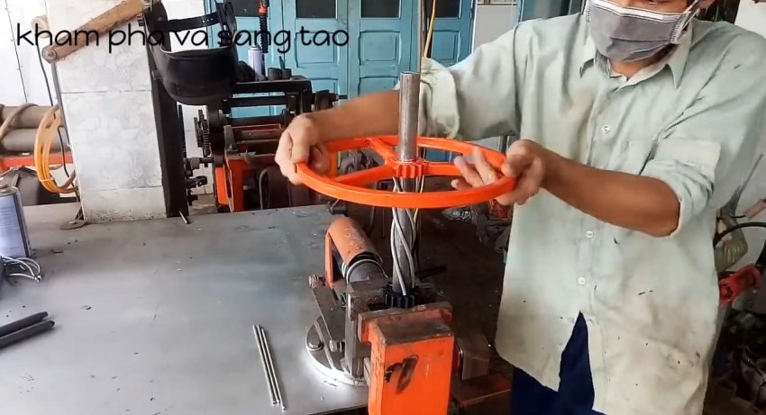 Зажимаем отрезок профильной трубы в тиски. Между шестернями в отверстия вертикально вставляем стальные прутки диаметром 5 мм и длиной 22 см и совершаем штурвалом 1 оборот. В результате прутки изогнутся вокруг трубы и получат своеобразный изгиб.