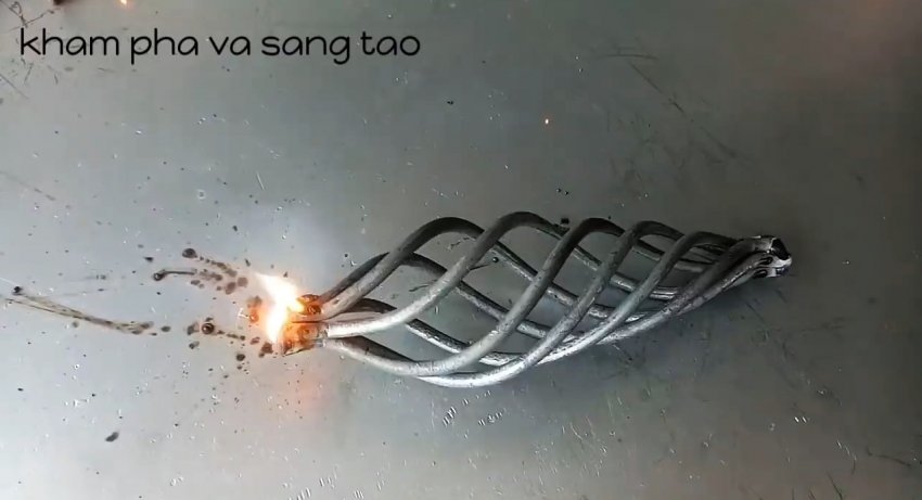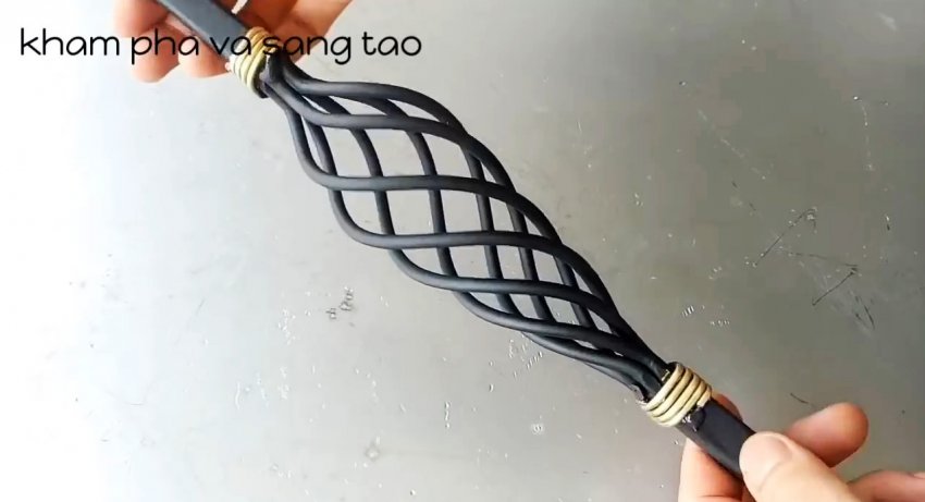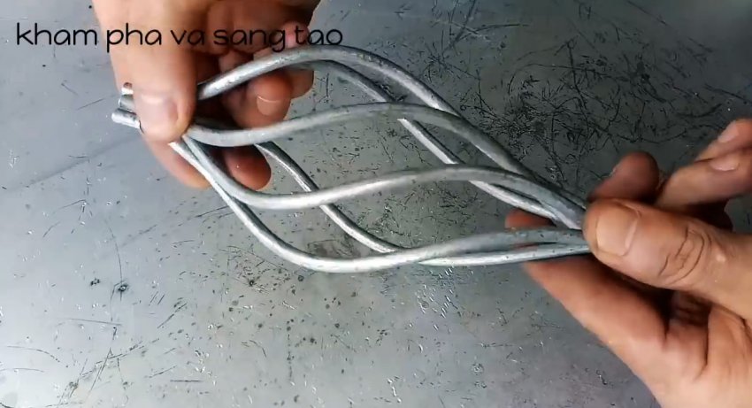 Шесть изогнутых прутков собираем в плотную упаковку и концы стягиваем резиновыми кольцами. Затем расправляем прутки в корзину так, чтобы расстояние между прутками в любом поперечном сечении было одинаковым. После чего концы прутков завариваем.