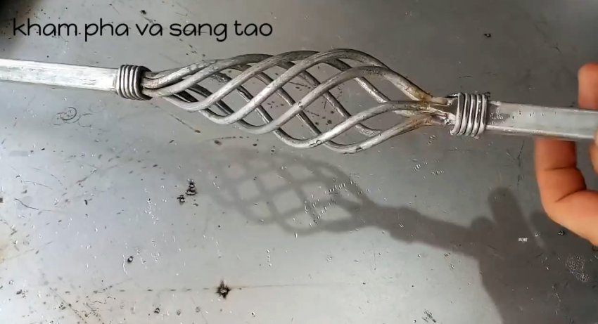 На обваренные концы надеваем отрезки профильных квадратных труб, которые также привариваем. Шлифуем места сварки болгаркой. Далее, начиная от труб, на основания корзинки плотно наматываем отожженную проволоку для маскировки места сварки.