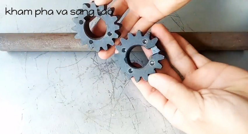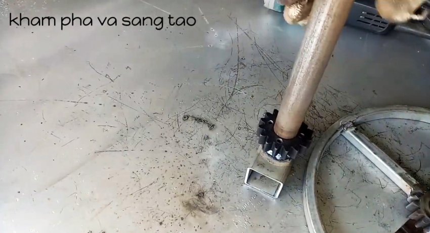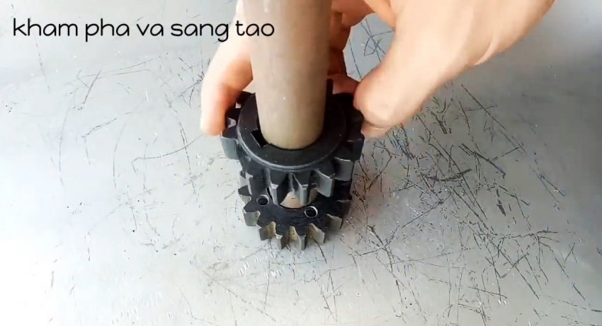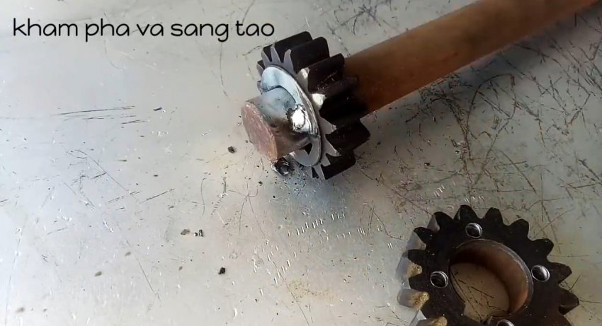 В центральное отверстие одной из шестерен диаметром 25 мм со стороны 4-х просверленных отверстий вставляем трубу диаметром 24, 5 мм и длиной 33 см. Сделав вылет в 2-3 см с другой стороны шестерни, привариваем ее к трубе.