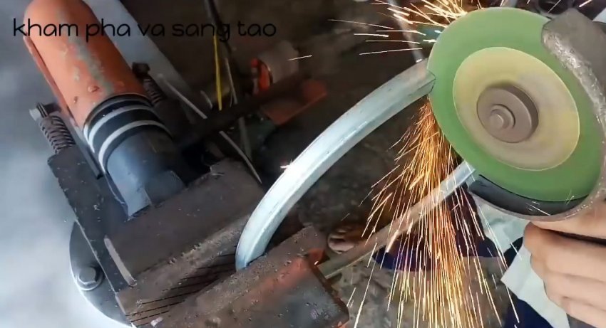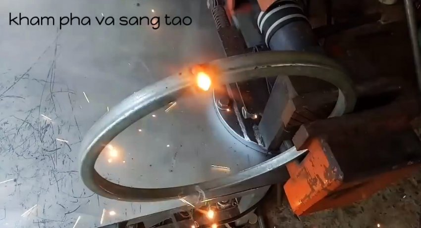 Из профильной квадратной трубы меньшего типоразмера на ручном гибочном станке выполняем круг, подрезаем и свариваем концы и в результате получаем кольцо диаметром 29 см.