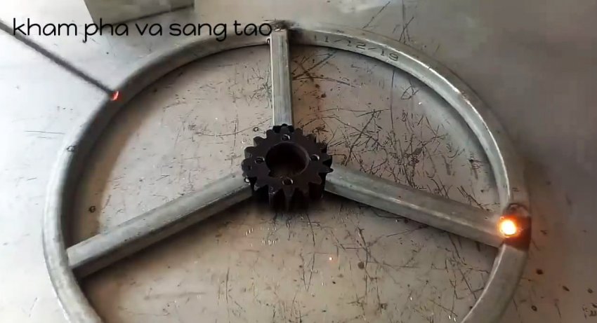 В центр полученного кольца укладываем вторую шестерню просверленными отверстиями вниз. Между кольцом и шестерней радиально укладываем 3 одинаковых по длине отрезка из квадратной трубы равномерно по окружности, т. е. через 120 градусов и все завариваем. В результате получается штурвал, состоящий из наружного кольца, трех спиц и шестерни посередине.