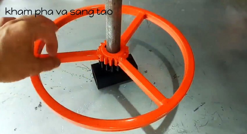 Надеваем шестерню штурвала просверленными отверстиями вниз на трубу, предварительно окрасив узлы устройства в разные цвета в соответствии с инженерной эргономикой. Штурвал должен свободно двигаться по трубе.