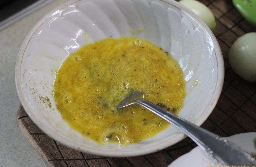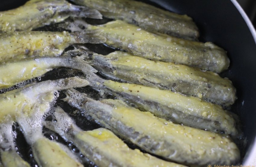 3. Окунуть мойву во взбитые яйца и выложить на раскаленную плоскую сковородку.