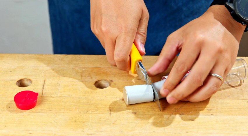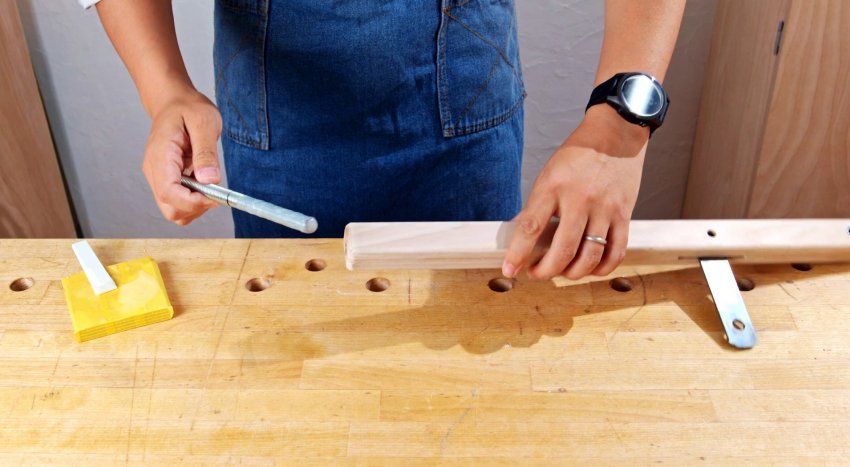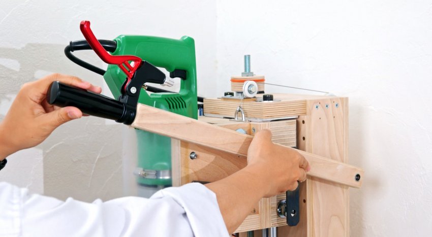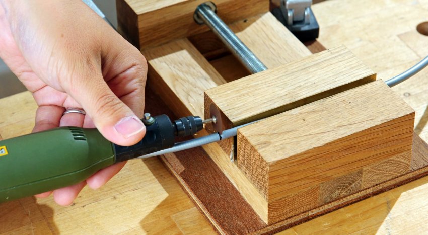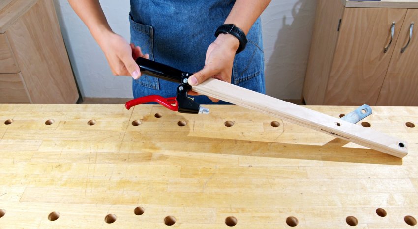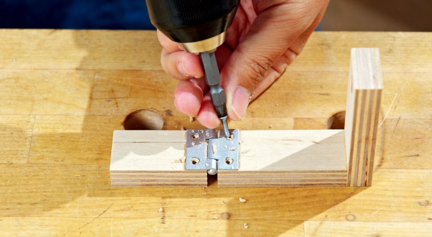 Из многослойной фанеры вырезаем два бруска, в одном по центру ближе к одному краю сверлим отверстие. Смазываем клеем меньший по площади торец бруска без отверстия и приклеиваем его к бруску с отверстием. Место склейки усиливаем двумя шурупами.
