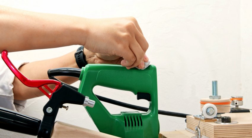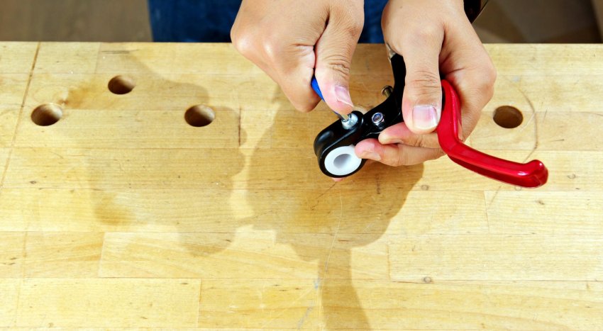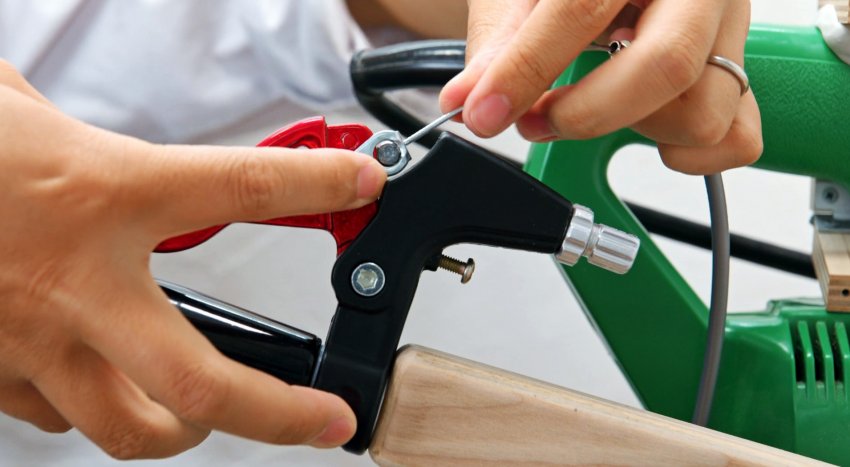 Один конец тросика закрепляем к ручке велосипедного тормоза, а другой пропускаем сверху через отверстие в бруске и затем крепим к торцу бруска под кнопкой с помощью пластины и двух шурупов.