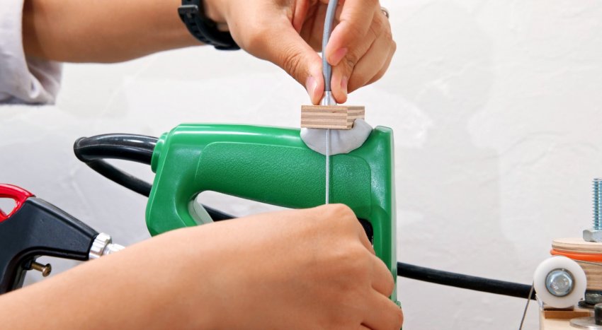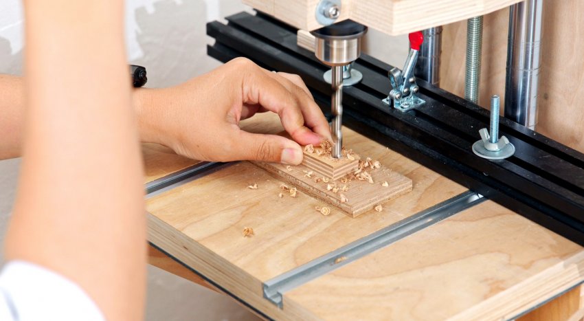 К торцу бруска без отверстия крепим с помощью мебельной петли брусок покороче. С помощью самозатвердевающего пластика крепим сверху ручки дрели над кнопкой ее включения брусок с отверстием так, чтобы нижний брусок оказался под кнопкой.