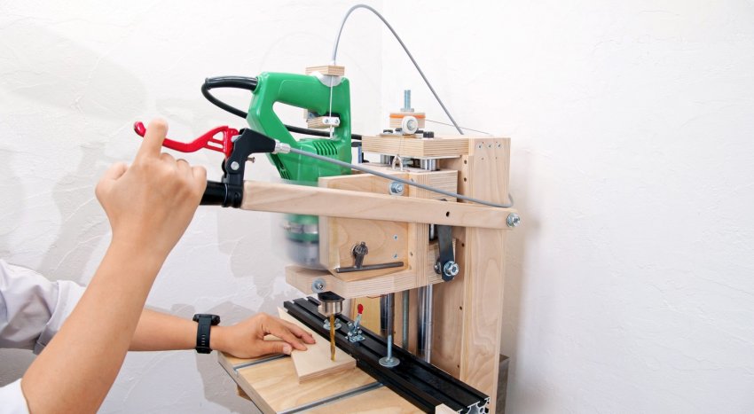 При работе на станках желательно, чтобы хотя бы одна рука была свободной. С этой целью совместим рычаг включения дрели, служащей приводом для самодельного сверлильного станка, с рукоятью подъема и опускания шпинделя.