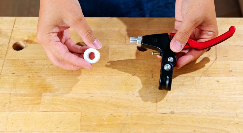 В хомут ручки велосипедного тормоза вставляем пластиковую втулку и затягиваем стяжной болт. Закрепляем ручку на резьбовом стержне так, чтобы она была расположена с противоположной стороны поводка, путем навинчивания и затяжки пластиковой ручки с резьбовым отверстием спереди.