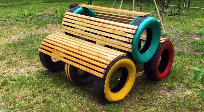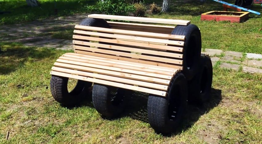 У многих автолюбителей имеется несколько ненужных покрышек, которые некуда использовать. Из них можно изготовить простую, но удобную лавку. Для этого нужно приготовить покрышки, деревянный брус или доски, дрель, шлифовальную машинку и болты.