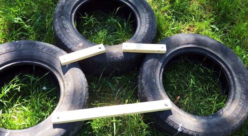 На земле необходимо разложить покрышки треугольником, при этом нижние две должны быть на небольшом расстоянии друг от друга.