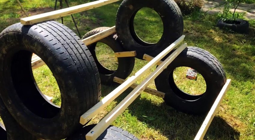 Все их нужно скрепить планками и болтами, чтобы они обеспечивали нужную жесткость лавке. В первую очередь необходимо прикрутить верхние и нижние доски, чтобы выставить покрышки. Для крепления бруса нужно использовать дрель – необходимо просверлить отверстия в покрышках, чтобы вставить в них соединительные болты.