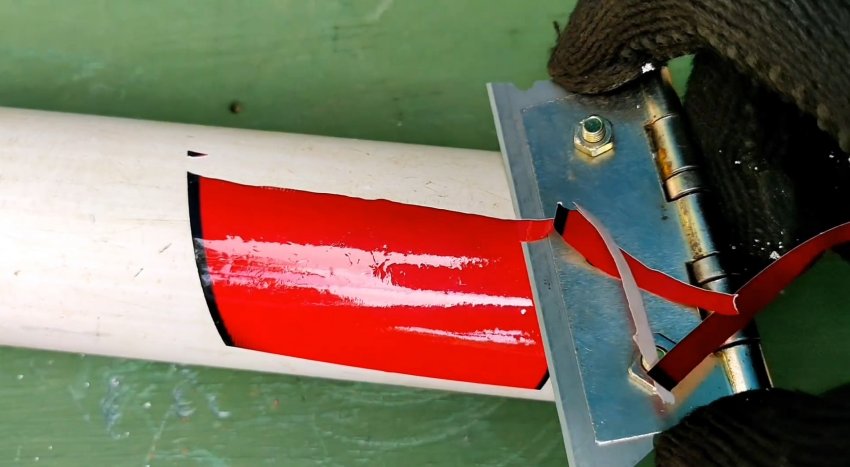 Здесь лезвие не крепится через отверстие, а просто сжимается половинками шарнира. Режущая кромка находится снаружи петли. Стругом можно удалять пластиковые наклейки и даже тонировочную плёнку автомобиля.