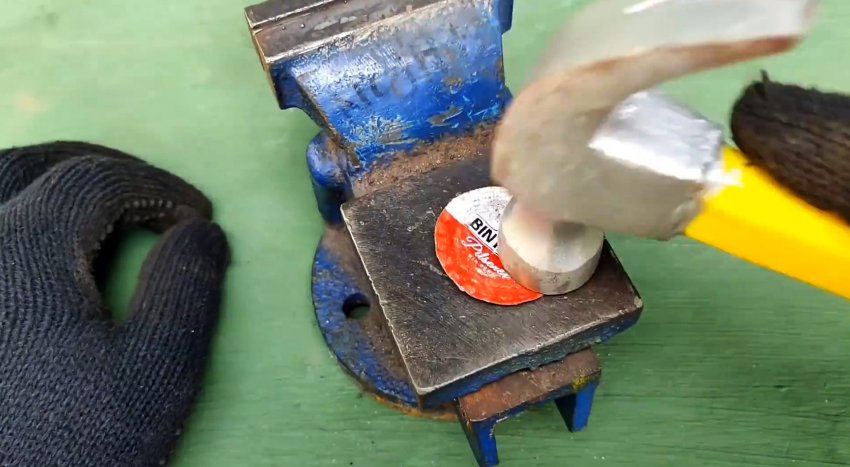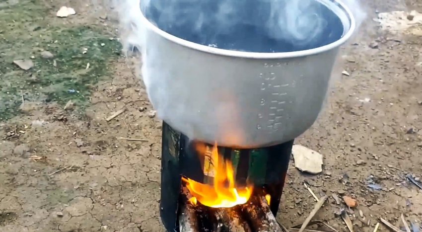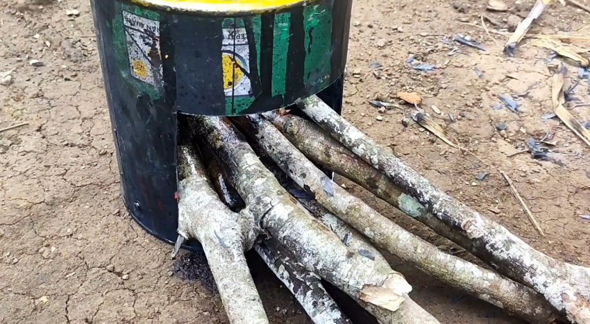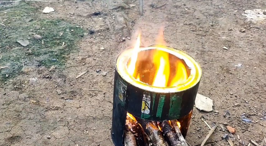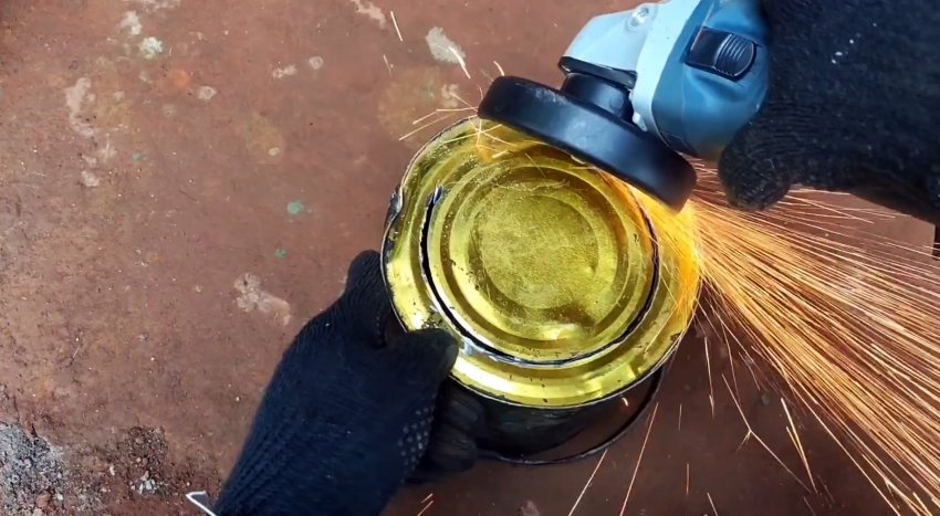 Понадобится болгарка, чтобы вырезать большой круг в дне банки. Сбоку нужно прорезать прямоугольное отверстие под топку.
