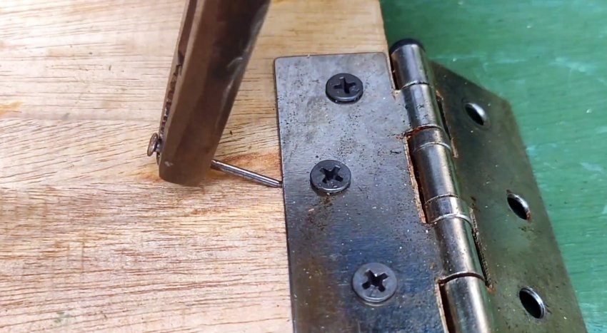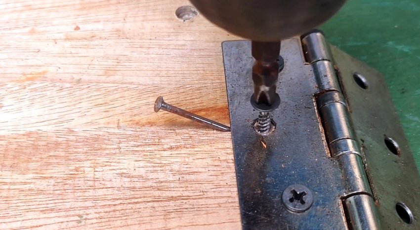 Сердцевина древесной плиты недостаточно плотная, поэтому саморезы при сильном усилии могут испортить резьбу в материале. Тогда шуруп, сколько ни крути, останется на месте. Выйти из положения поможет маленький гвоздь, подбитый под петлю напротив шурупа.