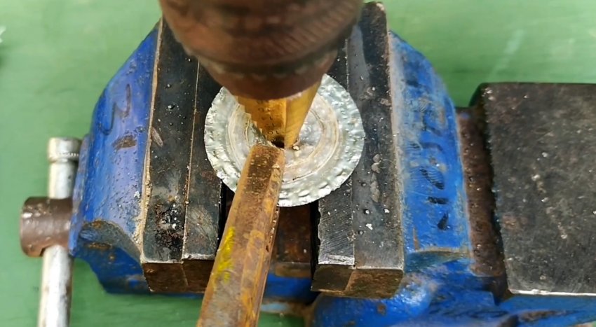 Пробку нужно расплющить, придать форму овала с зубчатой окружностью. Посреди пробки сверлится отверстие под тонкий болт, конец которого вставляется в дрель.