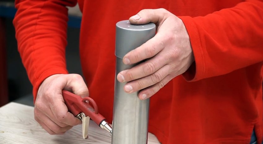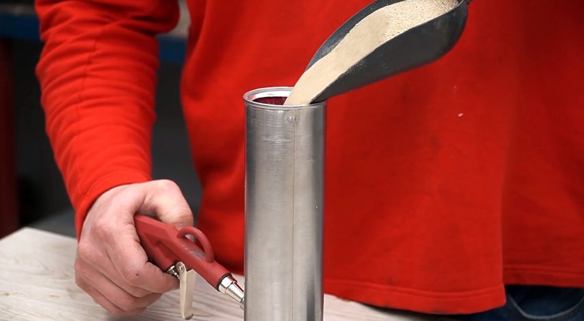 Насыпаем в аэрозольный баллончик через отверстие в донце мелко-просеянный песок, закрываем донце пластиковой крышкой, а продувочный пистолет подключаем к компрессору и включаем его.