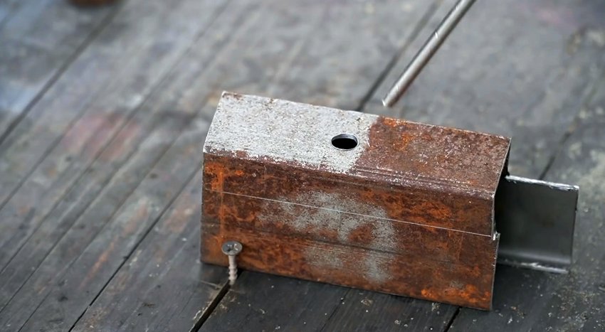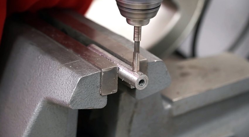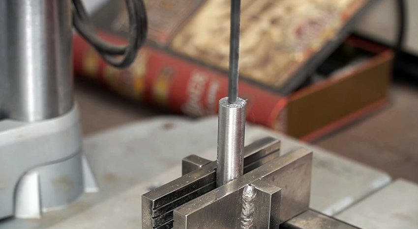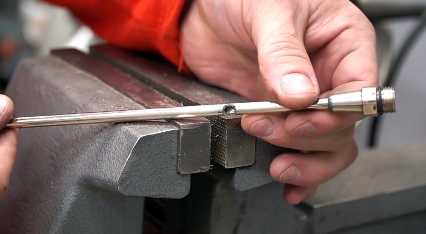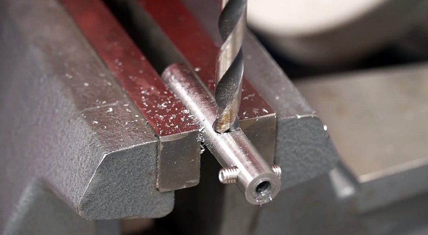 В металлическом стержне сверлим по центру сквозное отверстие в направлении продольной оси. Также ближе к одному краю выполняем поперечное сквозное отверстие, в котором нарезаем резьбу, и вворачиваем с двух сторон фиксирующие винты.