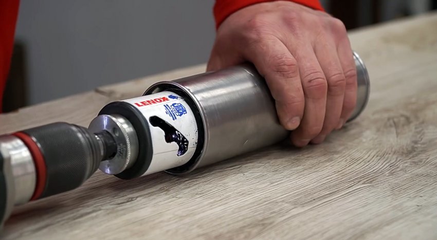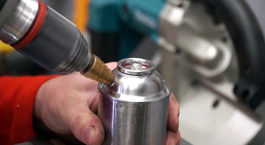 В донце баллончика посредством дрели и корончатого сверла выполняем максимально возможное по площади отверстие. Полукруглым напильником опиливаем образовавшуюся после сверления кромку.