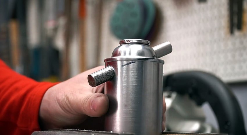 На сферической части крышки и в корпусе баллончика сверлим одинаковые по диаметру отверстия под стальной круглый стержень, который будучи вставленным в отверстия, должен занимать несколько наклонное положение по отношению к вертикальной оси баллончика и выступать за его пределы на некоторое расстояние.