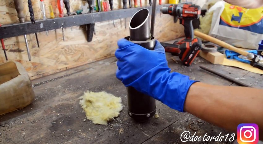 В кольцевой зазор между трубами плотно набиваем минеральную вату с утрамбовкой и плотно закрываем зазор вторым элементом конической заглушки с использованием молотка. Также по окружности высверливаем отверстия и скрепляем детали заклепками.