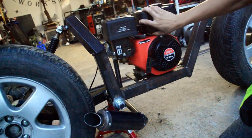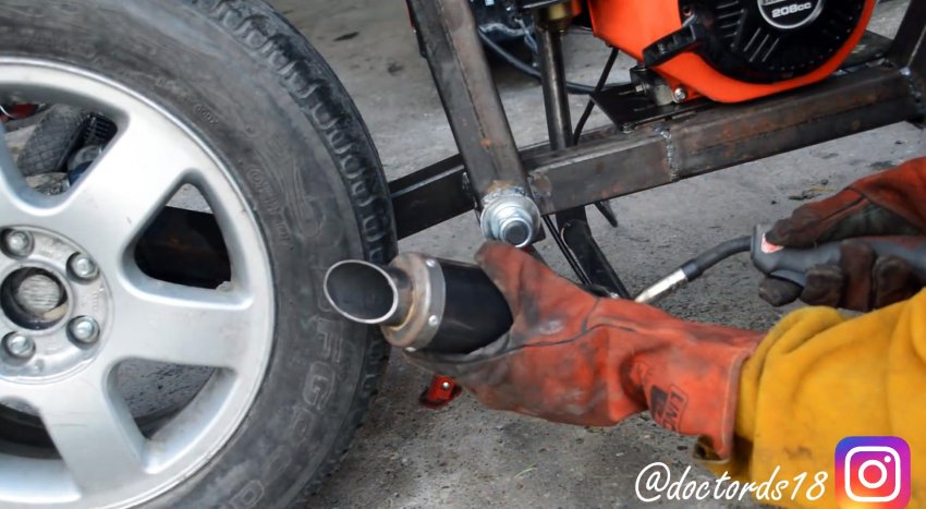 Укорачиваем выхлопной патрубок и с помощью отрезков труб и поворотников выполняем выхлопную систему, которую завершаем подсоединением нашего самодельного глушителя.