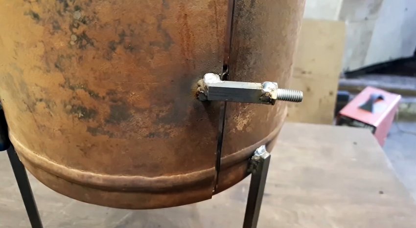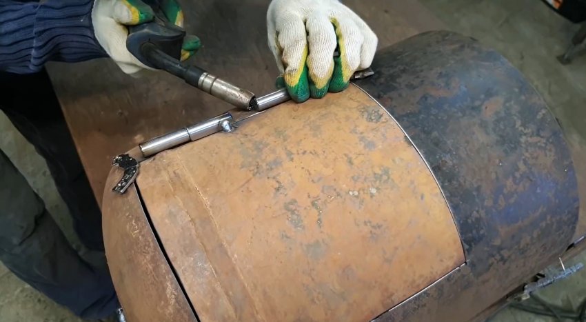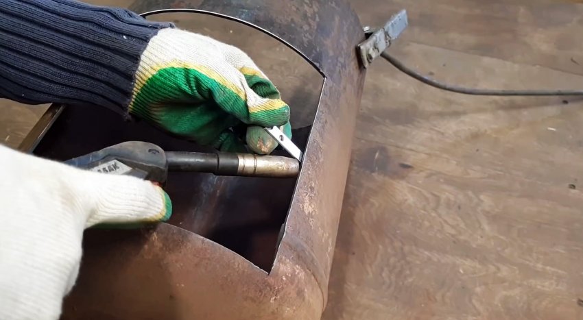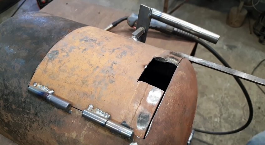 Дверцу двумя петлями привариваем к боковой стороне баллона напротив ограничительной пластины.