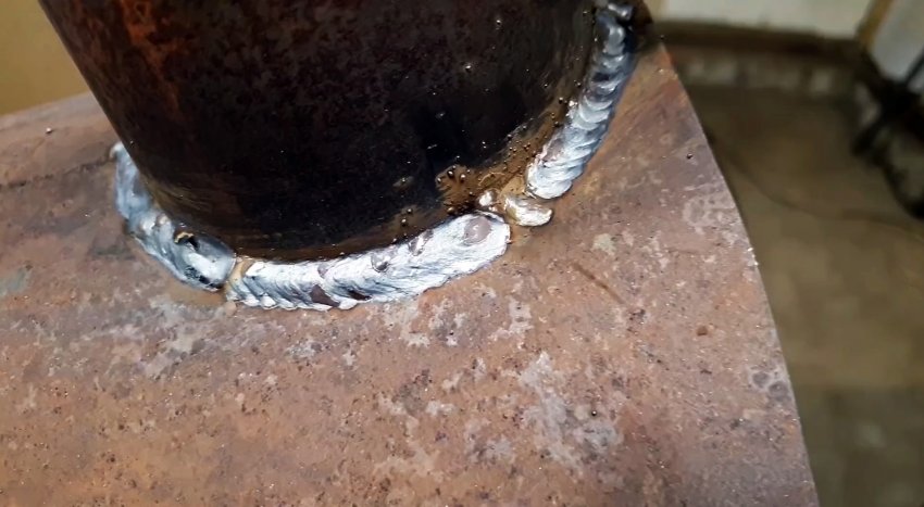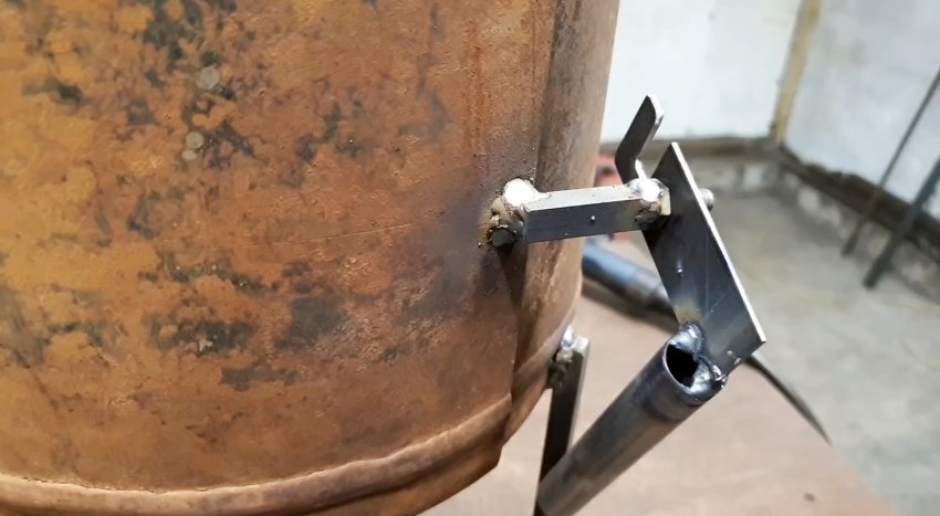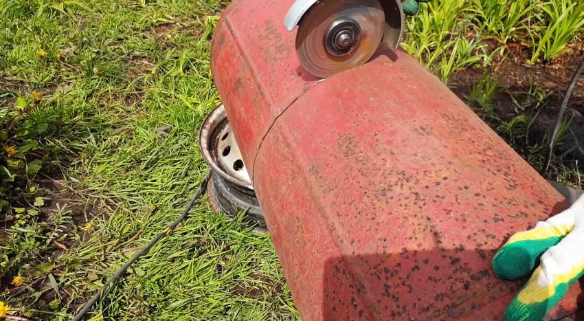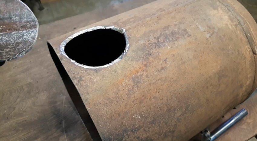 С противоположной от дверцы стороне части газового баллона ближе к верху вырезаем круглое в плане отверстие, к которому привариваем «колено» из трубы диаметром 108 мм для установки дымовой трубы.