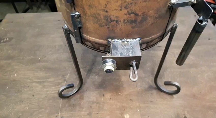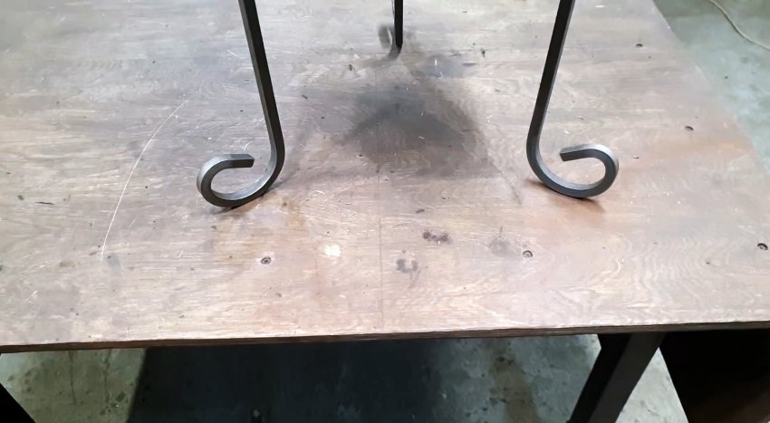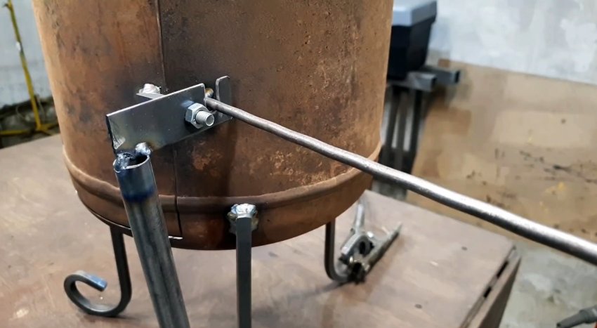 Изгибаем три одинаковые заготовки из квадратного прутка и привариваем их к верхнему днищу через 120 градусов по кругу.