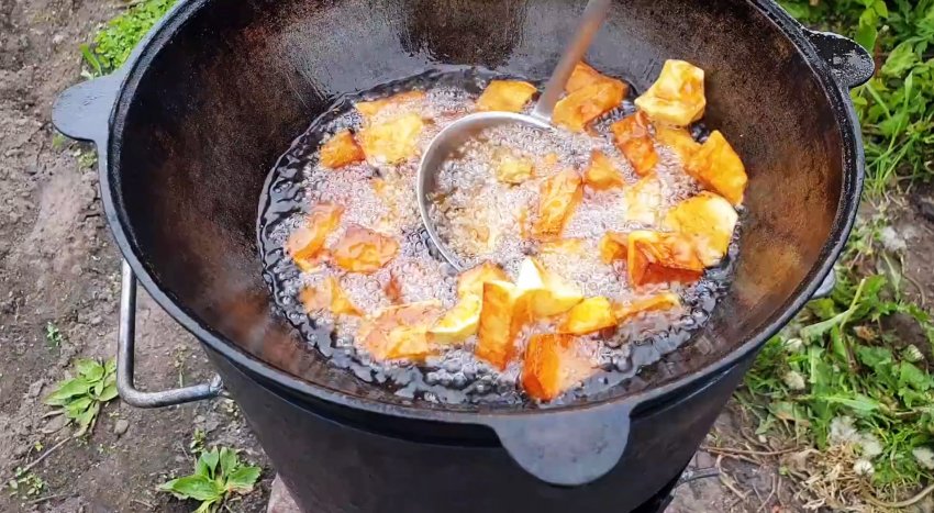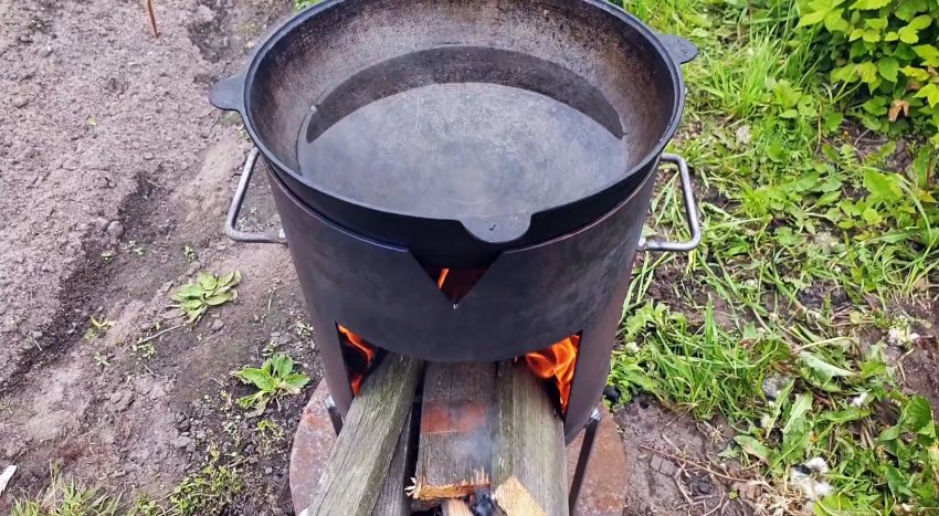 Простейшая печь под казан не имеет дверцы, трубы и поддувала. Ее легко изготовить с минимальными затратами. Дым выходит через специальные отверстия сверху печи и дверной вырез. Несколько повышенный расход дров из-за отсутствия регулировки тяги.