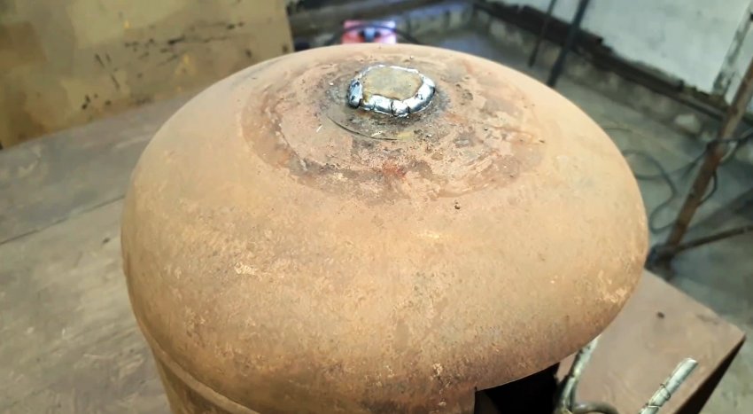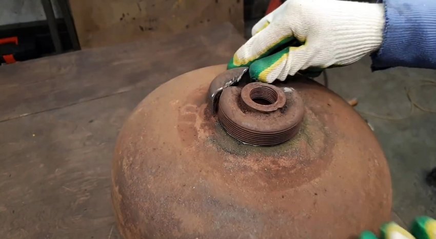 Для удаления резьбового кольца горловины распиливаем ее поперек болгаркой и выламываем с помощью долота. Отверстие в баллоне завариваем металлическим пятаком.