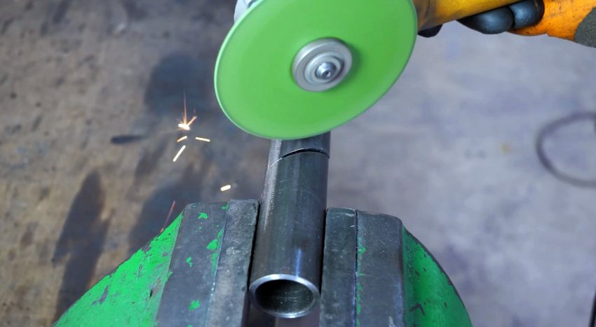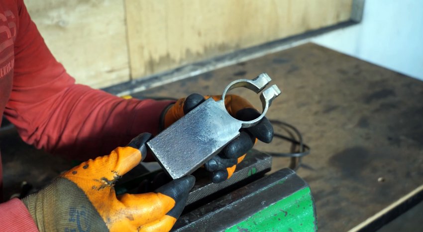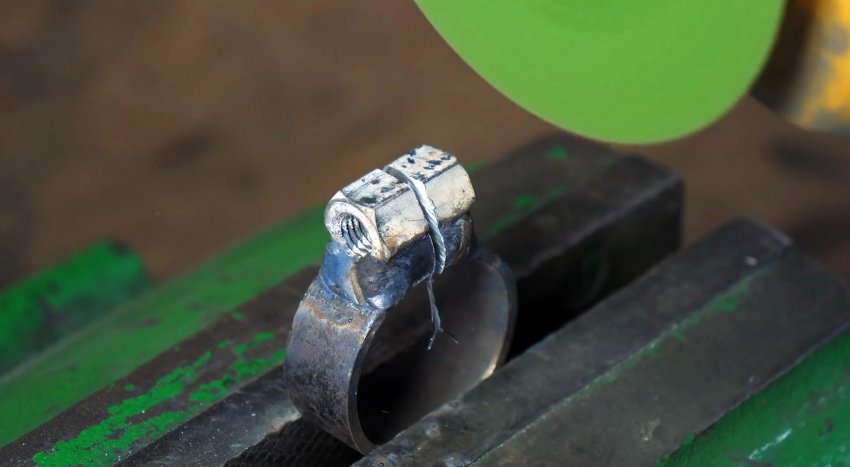Отрезаем от той же трубы неширокое кольцо, протачиваем и скругляем торцы. Укорачиваем удлиненную гайку и привариваем ее часть к кольцу снаружи в тангенциальном направлении. Разрезаем гайку поперек вместе с кольцом и сварным швом, который сравниваем с внутренней поверхностью разрезного кольца.