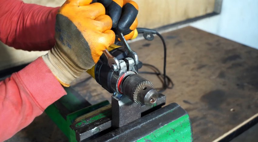 Привариваем кольцо с гайкой разрезом вверх продольно к заготовке прямоугольного сечения большой толщины. В разрезное кольцо вставляем силовой поясок корпуса шуруповерта и закрепляем с помощью болта и гайки.