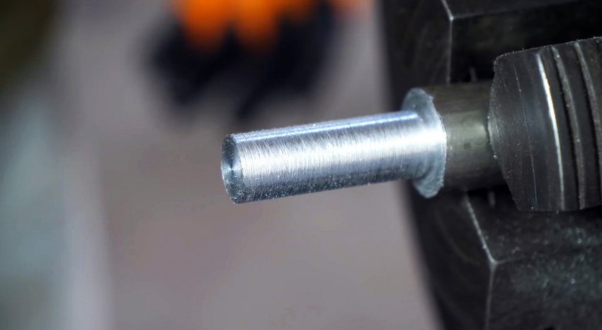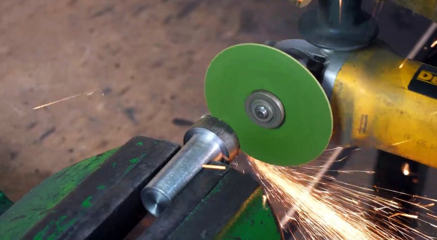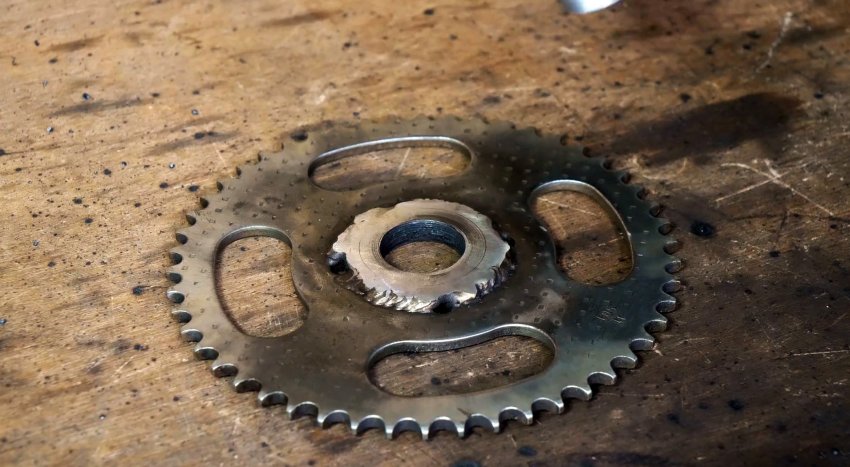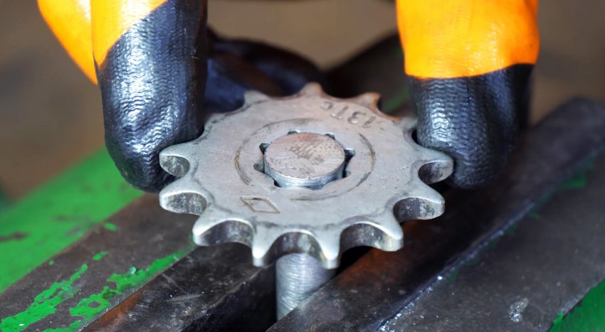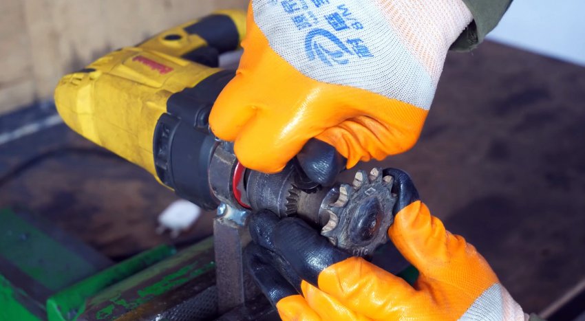 Изготавливаем из того же круга еще одну ось с головкой и упором, и привариваем к центральному отверстию малой звездочки. Вставляем полуось в патрон шуруповерта и надежно затягиваем.