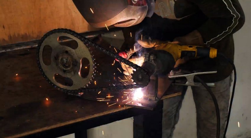 Надеваем на большую звездочку передаточную цепь, натягиваем ее малой звездочкой и, обеспечивая плоскостность, привариваем упор хомута с шуруповертом к квадратной плите-основанию.