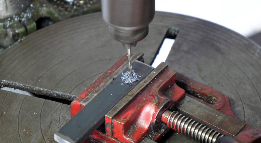 Отрезаем от полосы средней толщины кусок, с одного края сверлим отверстие и привариваем его к плите напротив начала спирального разреза на трубе. Через отверстие пропускаем конец проволоки, который загибаем крючком для зацепа ребра пластины в трубе.