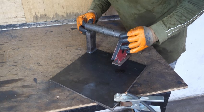 Трубу концом без спирали укладываем на прямоугольную в сечении заготовку, другой конец подпираем магнитным фиксатором. Причем труба должна быть параллельна стороне плиты-основания. В таком положении трубу привариваем к заготовке.
