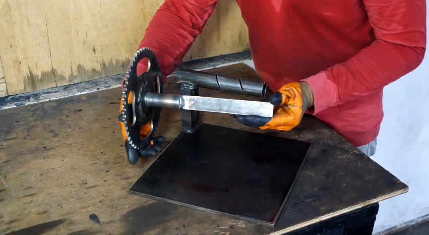Из стальной полосы меньшей толщины вырезаем пластину, соразмерную с диаметром и длиной трубы со спиральной прорезью, и привариваем ее вертикально к оси большой звездочки. Вставляем пластину и ось большой звездочки в трубу со стороны без спиральной прорези.