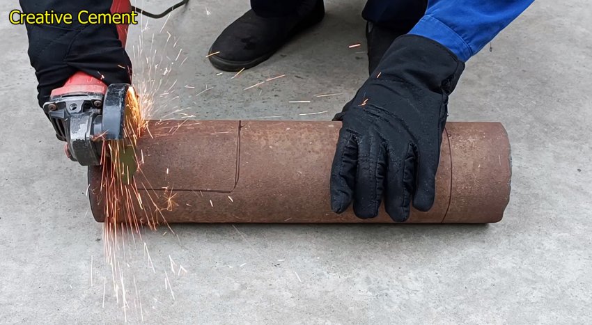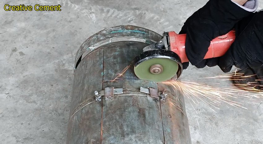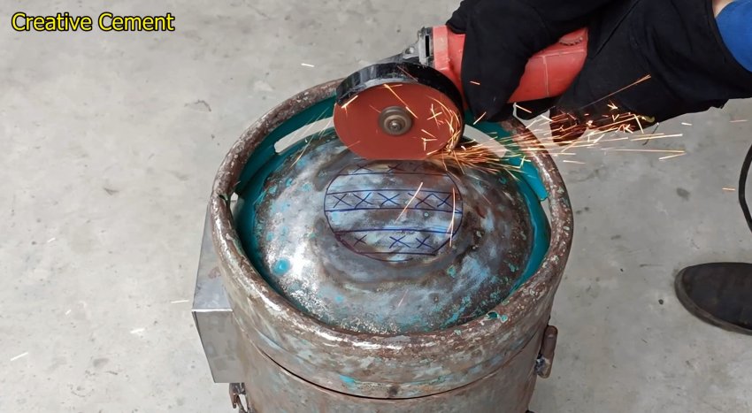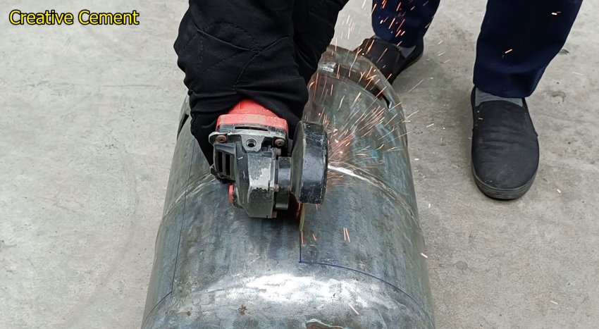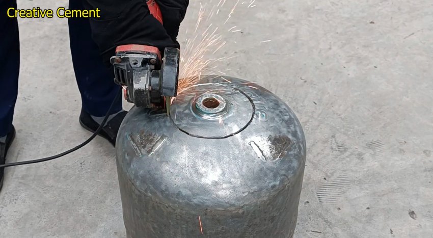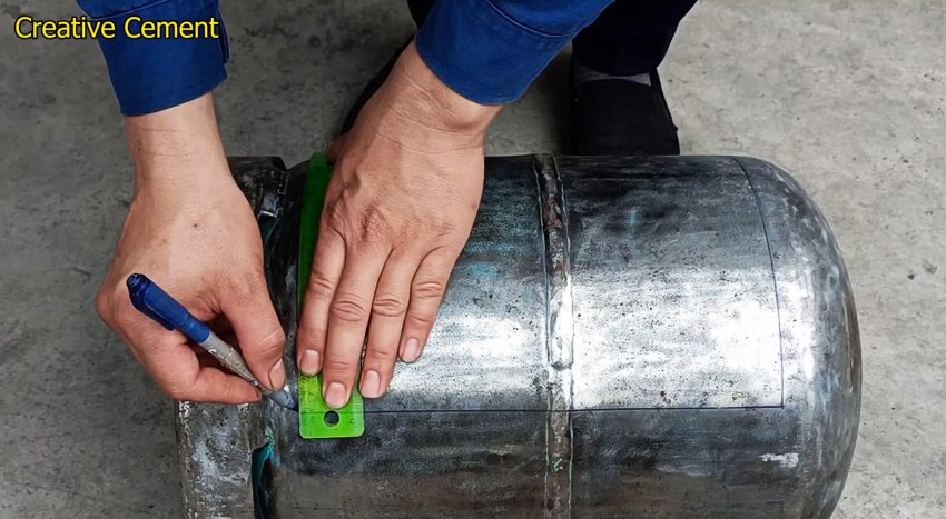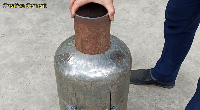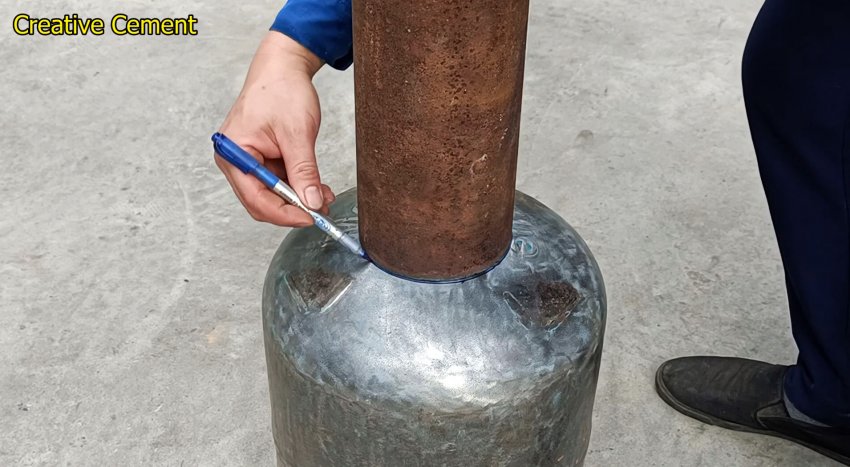 Теперь берем толстостенную стальную трубу 125 мм, и обводим вверху баллона. Затем по этому контуру вырезаем отверстие.