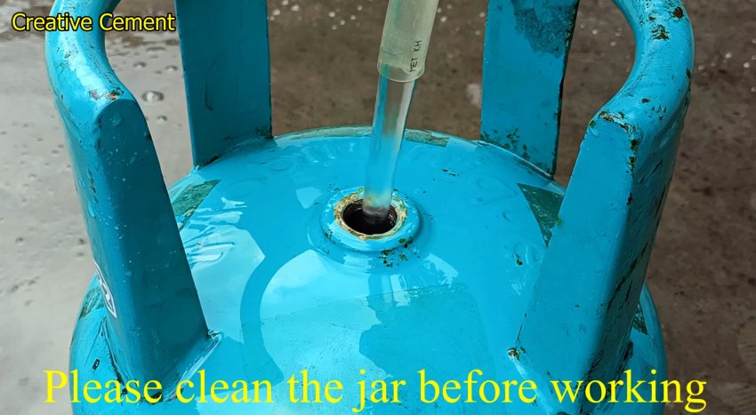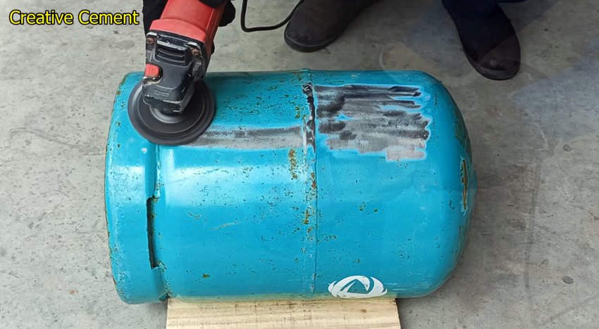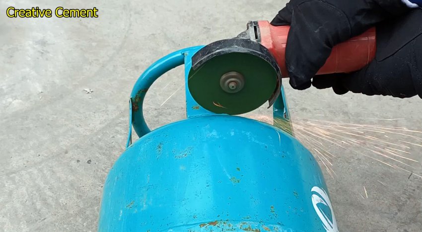 Переворачиваем баллон, и вырезаем в его дне отверстие под размещенную внутри вертикальную трубу.