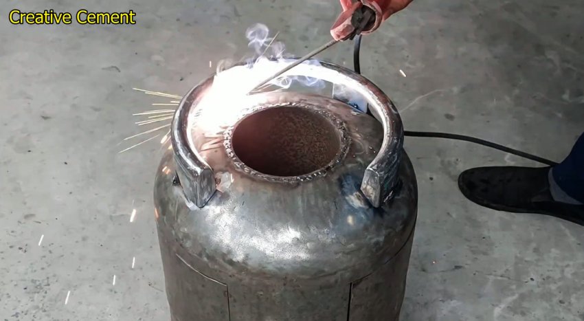 Круглая труба приваривается сплошным швом к баллону вверху.
