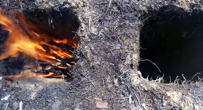 Теперь в одну ямку закладываем дрова, и поджигаем. В результате происходит движение теплого воздуха вверх, от чего кислород для горения затягивается через пустую скважину. Образуется пламя с сильной тягой, которое совсем немного выходит над поверхностью. В результате при горении дыма получается немного.