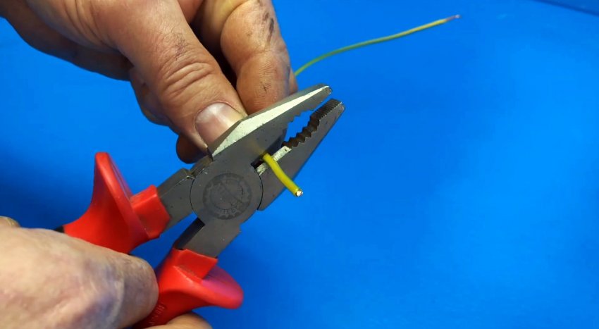 Чтобы зачистить провод, сначала прорежьте его изоляцию по кругу, зажав кусачками на пассатижах. Затем ее отделенную часть можно стянуть, если захватить между боковыми выступами шарнира.